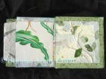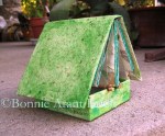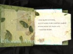 The House of Fresh Air is a repurposed board book which sits upon a repurposed box lid in order to approximate the appearance of a house. A haiku by Japanese haiku master Matsuo Basho reads I felt quite at home/as if it were mine sleeping lazily/in this house of fresh air. The haiku is on the base of the box, as well as on the first page of the book. A watercolor and colored pencil drawing of an epiphyllum cactus was cut into parts to illustrate the pages and the inside of the box. Two bamboo stems from our yard serve to hold the center pages of the book upright. The edges of the pages and the endpapers are in craft papers which utilize various types of leaves including banana plant leaves. The piece measures 5 3/8″ x 5 3/4″ x 5 1/4″. It is a single artwork, no edition.